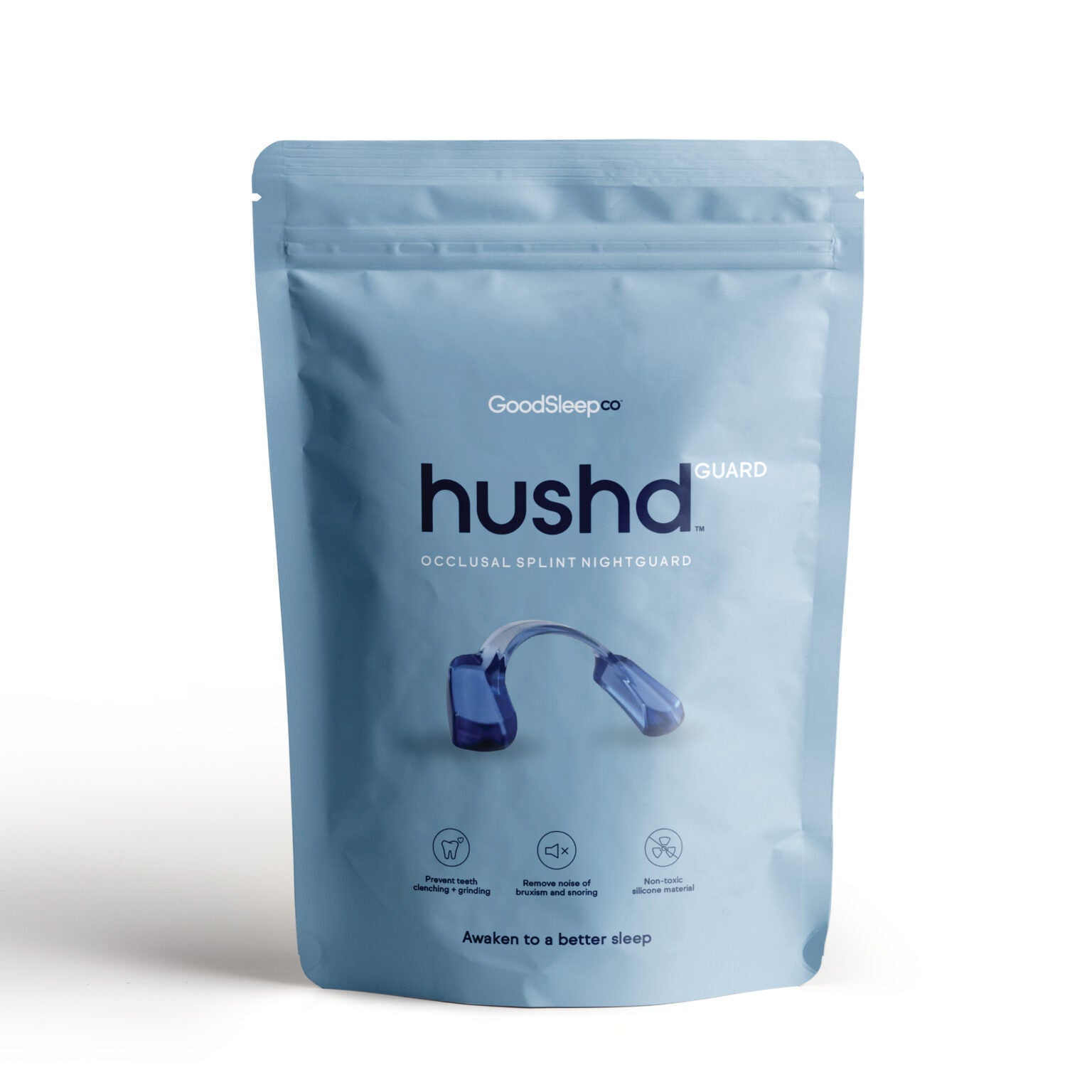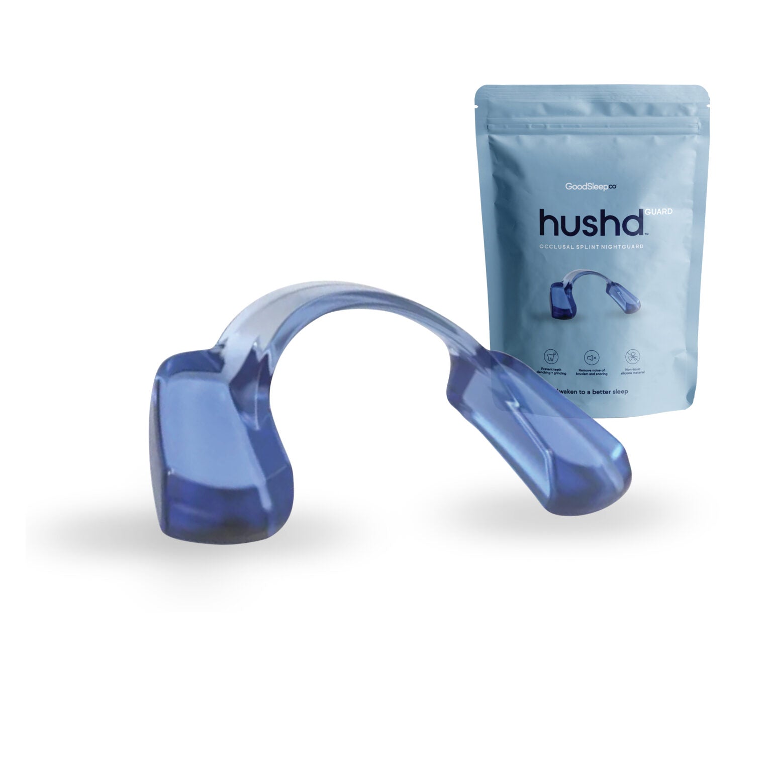The Hushd Guard is a temporary boil-and-bite Occlusal Splint Nightguard device that allows users to trial a bruxism solution prior to committing to a permanent device. Made from non-toxic silicone with cushioned bite-pads and a flexible band to ensure the splint is secure, the Hushd Guard protects from teeth clenching, grinding, and bruxism.